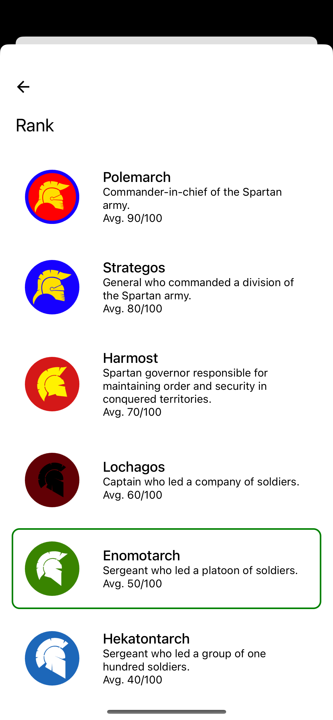 I got the Sparta army rankings from ChatGPT so not 100% about historical accuracy but still I like the idea of having progressively more elaborate badges and ranking names changing overtime. It feels nice to level up especially when its based off of real world actions!