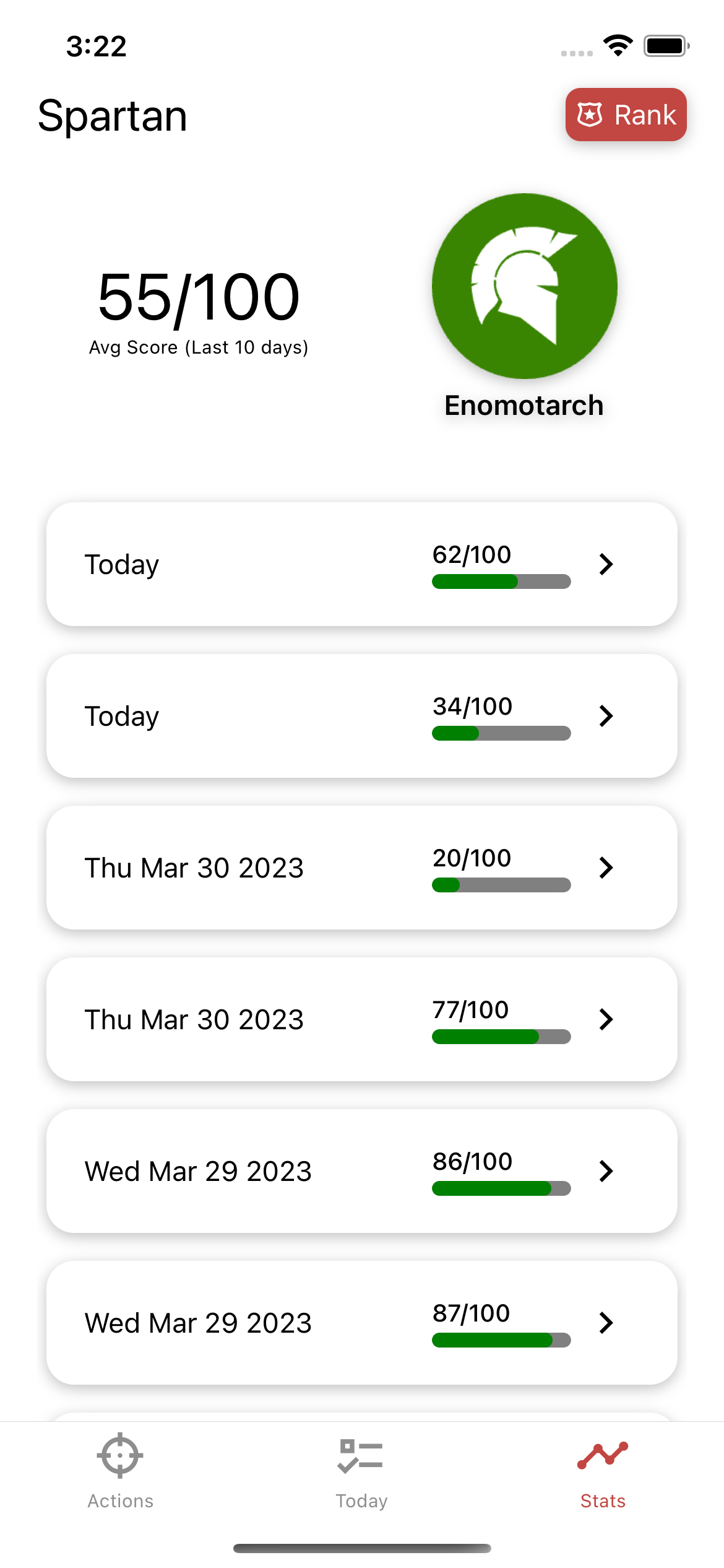The stats tab displays your average score and your current spartan ranking. This changes as your average changes and you get a different badge for each ranking level. The average is calculated by the previous days until you get to 10 daily reports. Then it's a 10 day rolling average. This more accurately reflects your recent efforts which helps with developing consistency as you're not plagued by past mistakes.